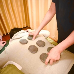 温めた石(玄武岩)を使って身体を温めながら行う施術法となります。ただの「温め」ではなく、深部まで熱を入れて筋肉を緩める手技で、手だけでは届きにくいところまでじんわり圧+熱で緩めるのが特徴です。